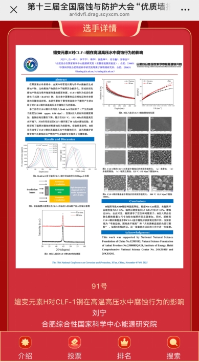刘宁作题目为嬗变元素HCLF-1钢在高温高压水中腐蚀行为的影响的海报展示。